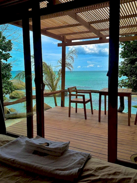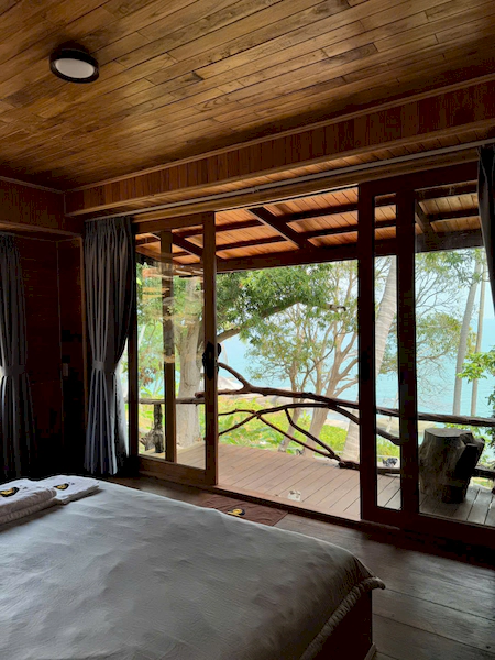 View nhìn ra biển cực chill từ cửa kính lớn.
