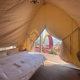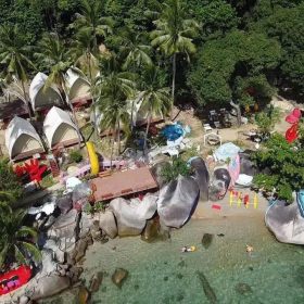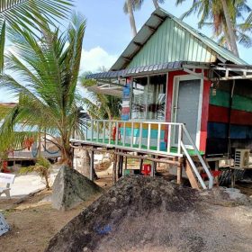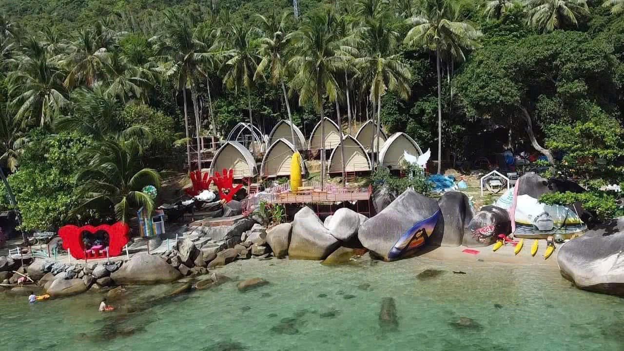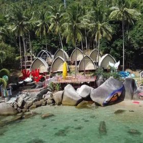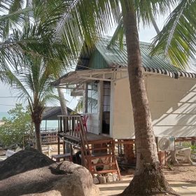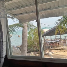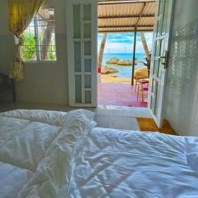 Vị trí: cách cảng 4 km, sát biển, bãi tắm riêng hơi đá nhưng vẫn thuận tiện tắm biển, có cây dừa nghiêng huyền thoại.
